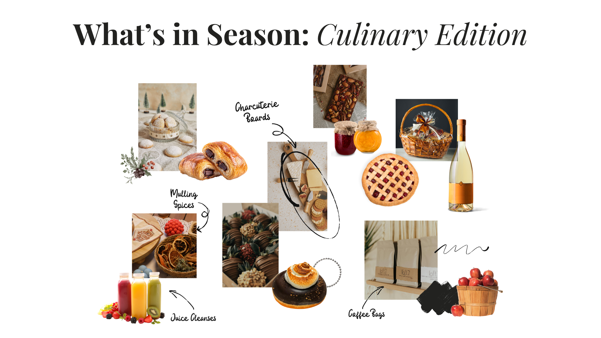 Gift Baskets • Artisanal Chocolates • Your Favorite Wine • Gourmet Donuts • Hand Picked Fruit • Pastries • Local Preserves • Roasted Coffee • Holiday Cookies •